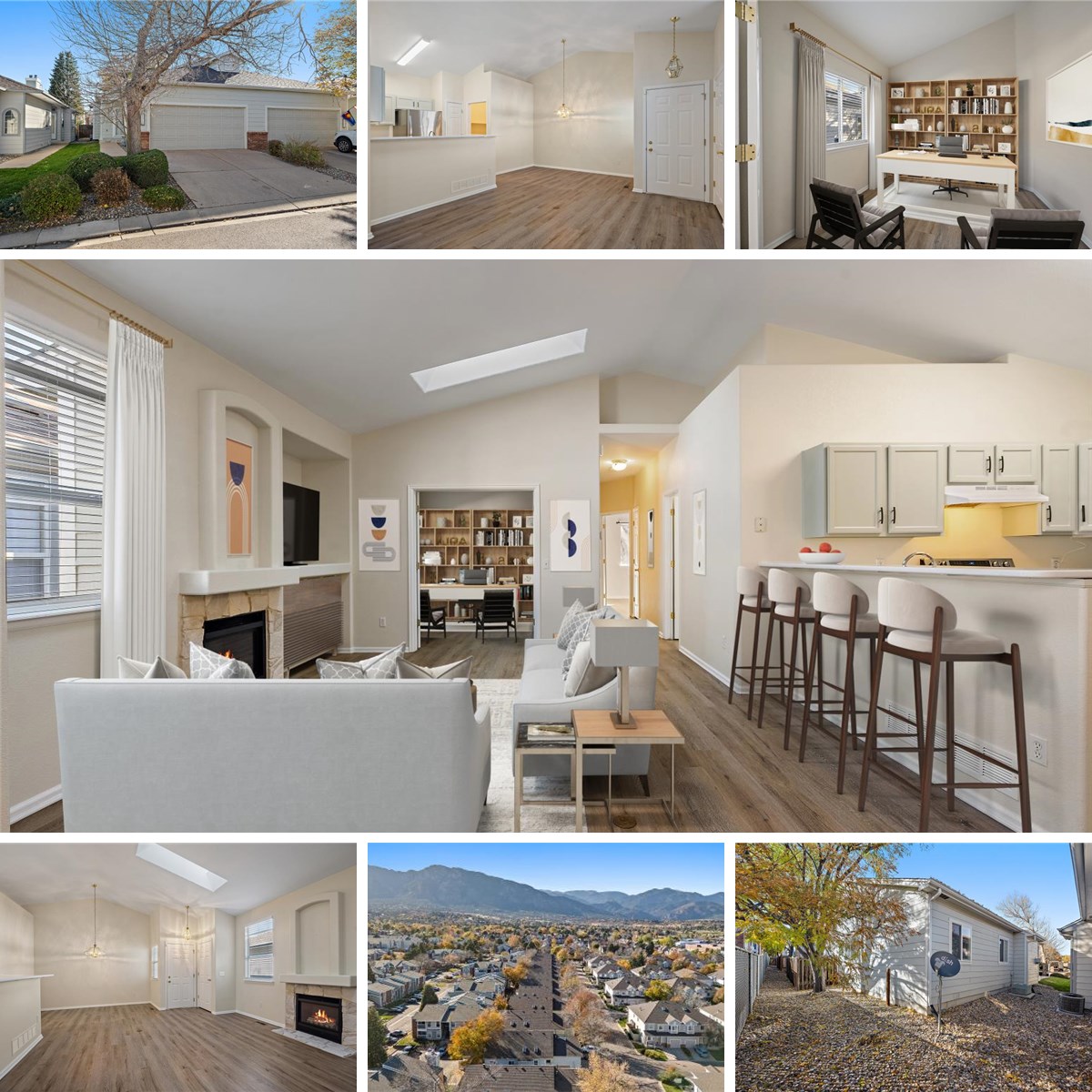 Imagine celebrating the holidays in your new home! This beautiful end-unit, ranch-style townhome offers convenient main-level living with the primary bedroom, en-suite bath, and spacious living area all on one floor. Elegant French doors open to a bright main-floor study, perfect for working from home or quiet reading. You’ll love the open floor plan, enhanced by vaulted ceilings and skylights that fill the home with natural light. Located in Foothills at Cheyenne Autumn, a gated community where the HOA maintains all landscaping, this home provides both comfort and peace of mind. The oversized primary suite includes a true walk-in closet and a luxurious five-piece bath. A second bedroom and full bath are ideal for guests or family. The inviting living room features a cozy gas fireplace for chilly evenings, while central air conditioning keeps the home cool in summer. Recent updates include newer luxury vinyl flooring and a refreshed fireplace surround. All appliances stay, including the washer and dryer—making your move-in easy. Enjoy a prime location within walking distance to the Country Club of Colorado, Quail Lake, parks, golf, bike trails, shopping, and dining. Conveniently close to downtown Colorado Springs, Peterson SFB, and Fort Carson.